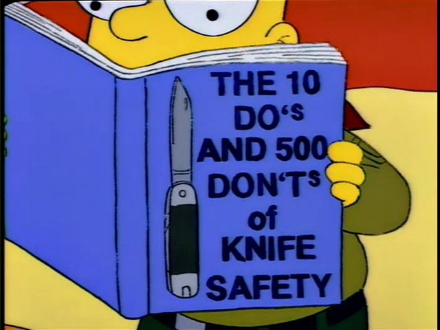 In order to pass the knife safety exam necessary to join the Junior Camper troop, Bart Simpson (the perennial eight year-old star of the television show The Simpsons) must read the safety booklet that will teach him everything he needs to know. Featuring a fictional character who always does the wrong thing named Donny Don’t, the booklet ominously warns its readers: “Don’t do what Donny Don’t does.”