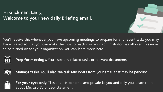 Nothing we do stands alone. Tasks connect with each other, tools integrate with each other, and Outlook recognizes that our work revolves around the different tools we use. Just recently, Outlook began to use its Cortana AI technology to review your email, tasks, calendar appointments and other data to advise you what you should be thinking about, planning for and working on by sending a daily Briefing email. The email arrives in your email early in the morning and helps you plan for the busy day ahead.
