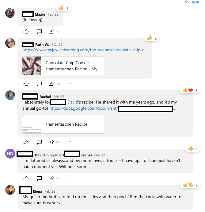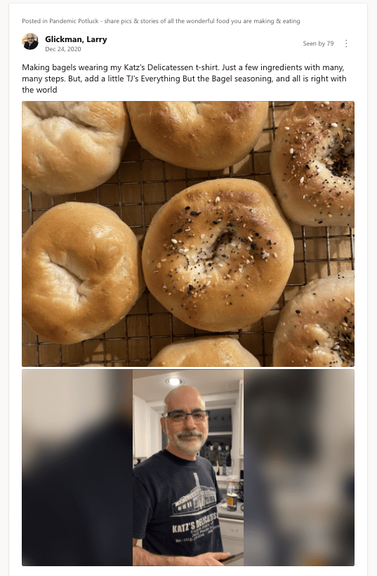 And our group was growing. And people had made the Pandemic Potluck community a Yammer “favorite” of theirs,. It would stay pinned on the left side of their Yammer screen so it would always be easy to see, and easy to return to. We all eagerly checked each day to see what new, yummy culinary masterpieces people were making.