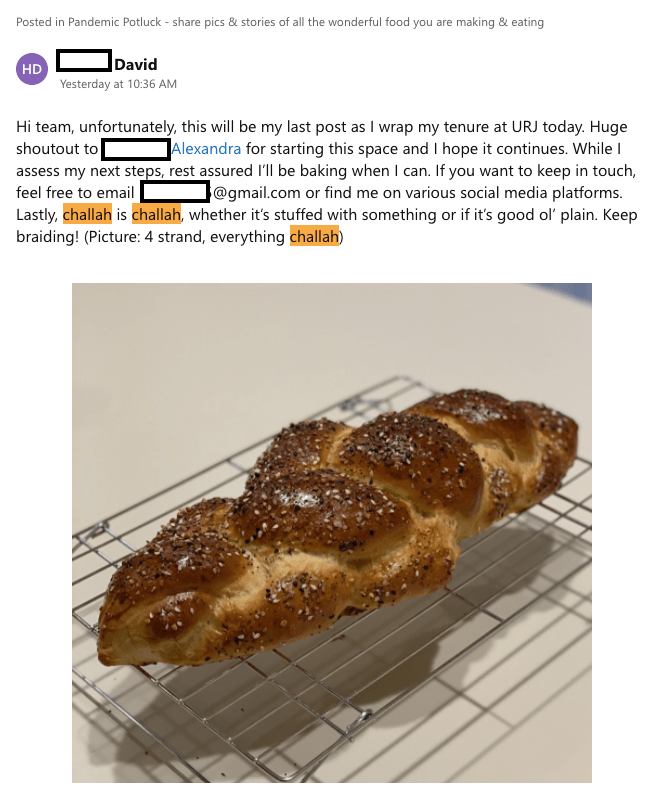 In fact, as a sweet and touching end to this tale of the Pandemic Potluck community, one of our colleagues who had been a regular contributor to the community recently decided to leave his job to pursue other opportunities. He made a farewell post in our Yammer network, in the Pandemic Potluck community. He posted a picture of a challah he recently made. He thanked our colleague Alexandra for starting the community. We couldn’t have planned this if we tried.